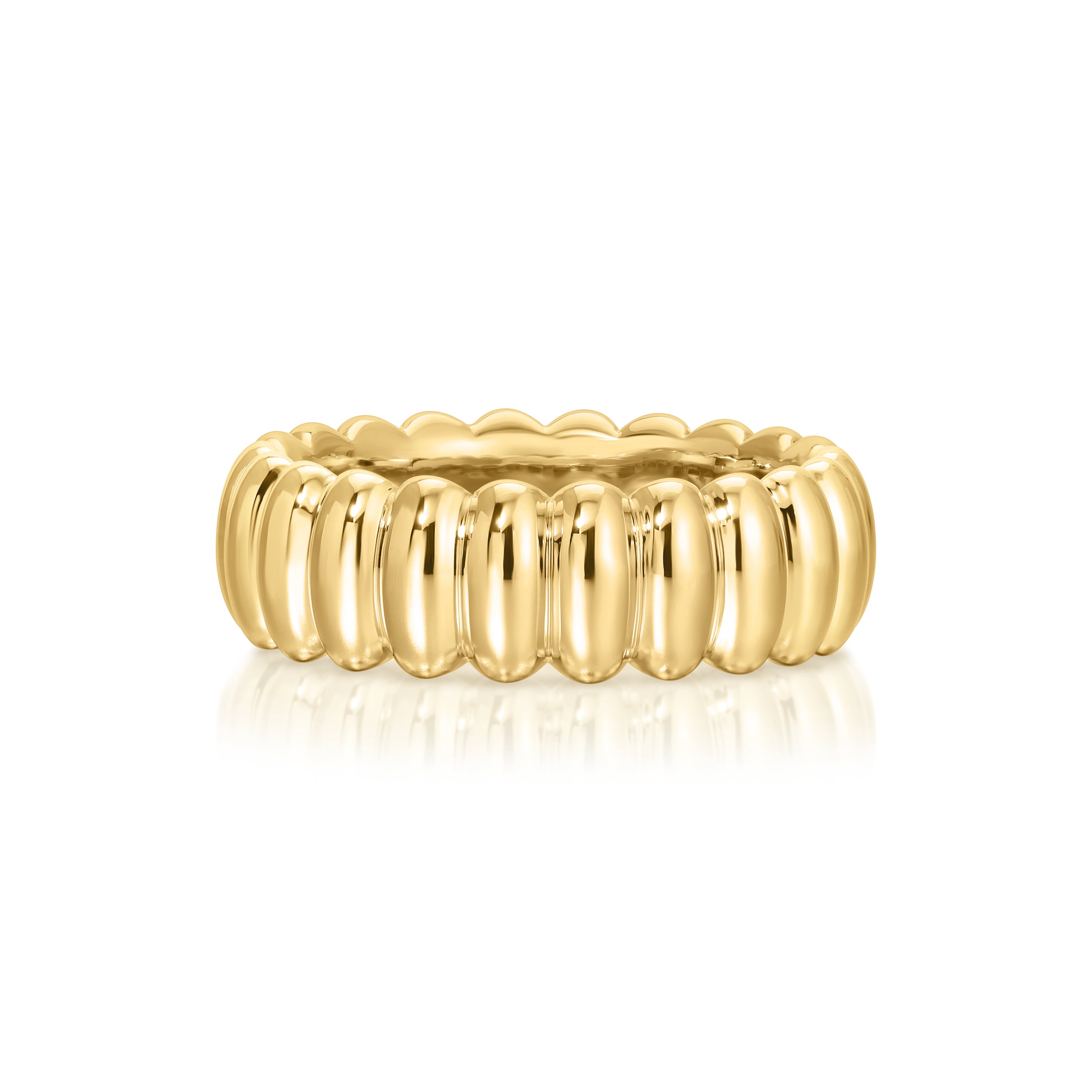 A 6.5mm wide pleated gold eternity band from our signature Reverie Collection.