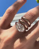An oval shape diamond set with East-West orientation our signature North-South Compass claw prongs – wrapped in a beautiful solid gold coil band. A fluid and whimsically eye-catching ring inspired by our Spiral Ring.